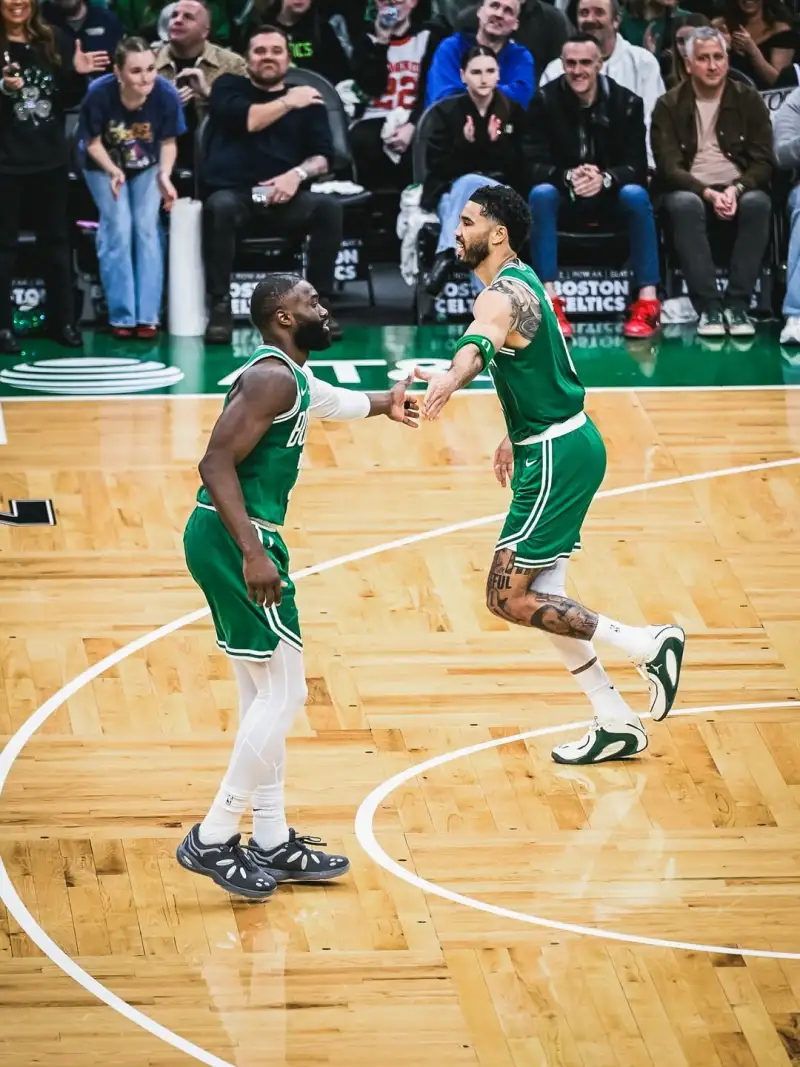 虎扑03月16日讯 凯尔特人官方更新Ins,晒出一组凯尔特人球员杰伦-布朗和杰森-塔图姆的赛场合影与球迷分享。